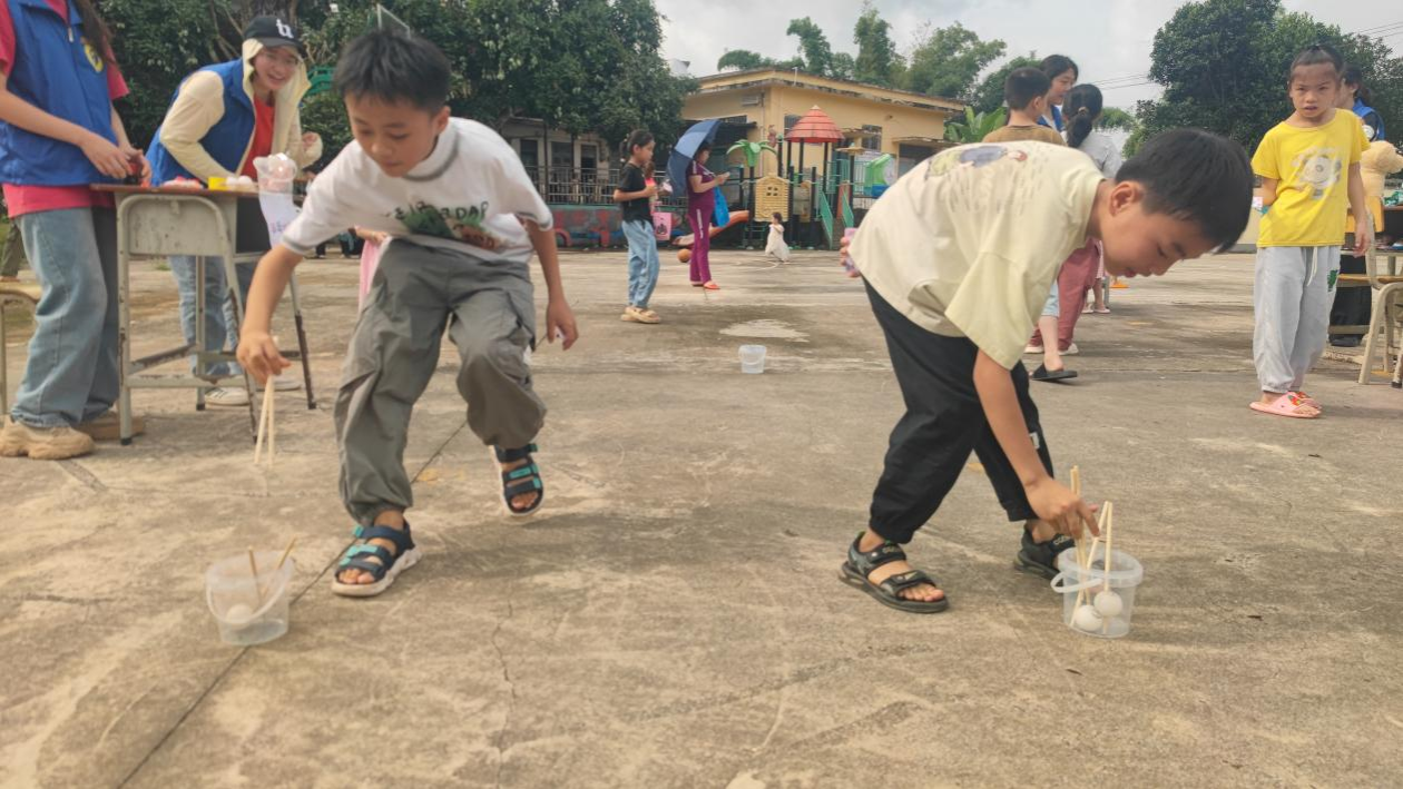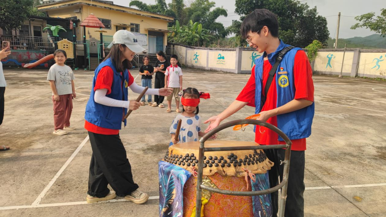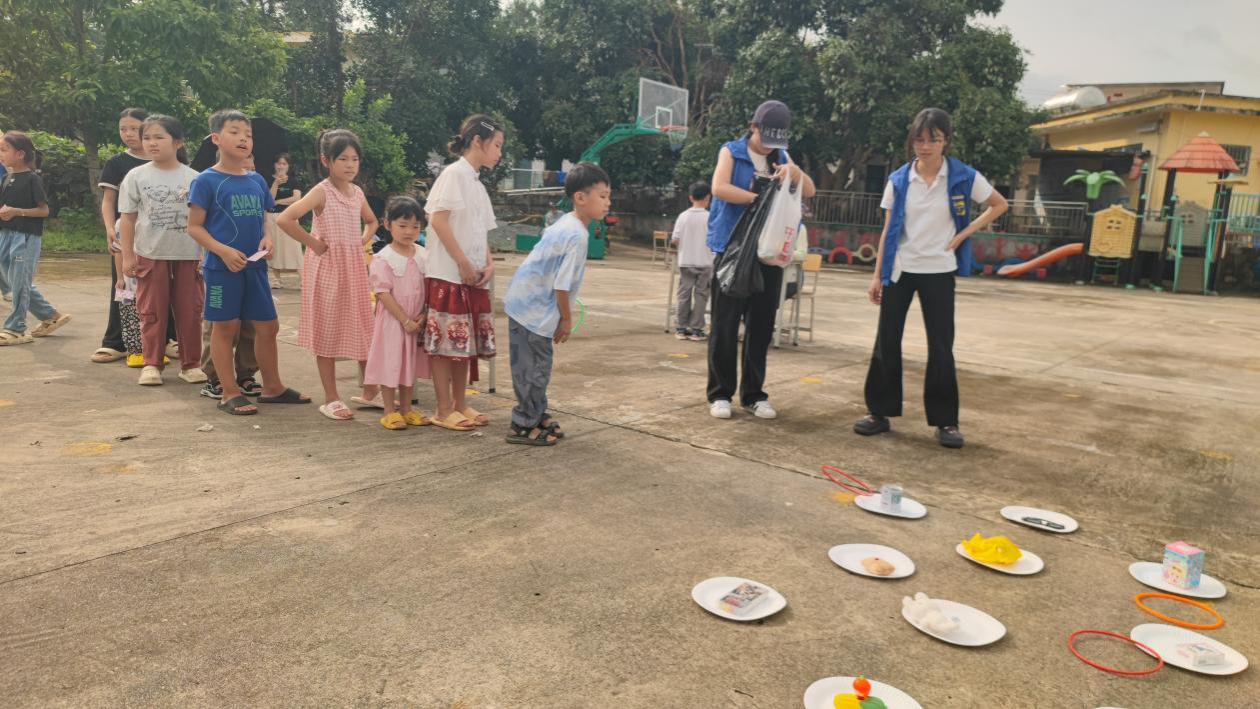 清晨时分,凉风爽人。实践团的成员相互配合,紧锣密鼓地布置着游园活动场地,而满怀期待的小朋友、围观热闹的村民也早早到达了现场。当八点的分针转到三十,游园活动正式拉开了序幕。孩子们手持活动卡片欢然入园,在各个游戏区穿梭。游园活动设置了趣味投壶、背篓抛绣球、齐心绕呼啦圈、蒙眼击鼓、趣味套圈圈、九宫格连线等游园互动区,游园场内欢声弥漫、热闹非凡,孩子们在互动中收获欢笑,也在尝试中感受协作的意义。