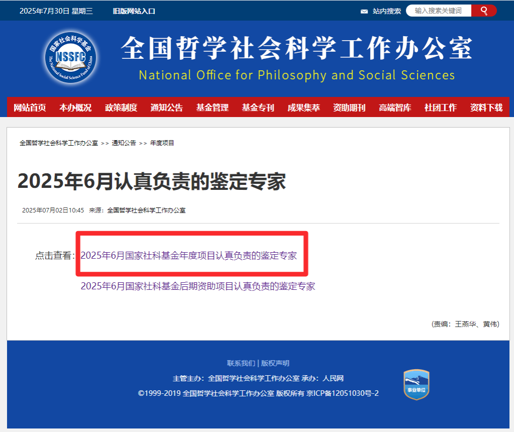 近日,全国哲学社会科学工作办公室官方网站公布了《2025年6月认真负责的鉴定专家》名单,公司历史系蓝韶昱教授被评为“2025年6月国家社科基金年度项目认真负责的鉴定专家”。