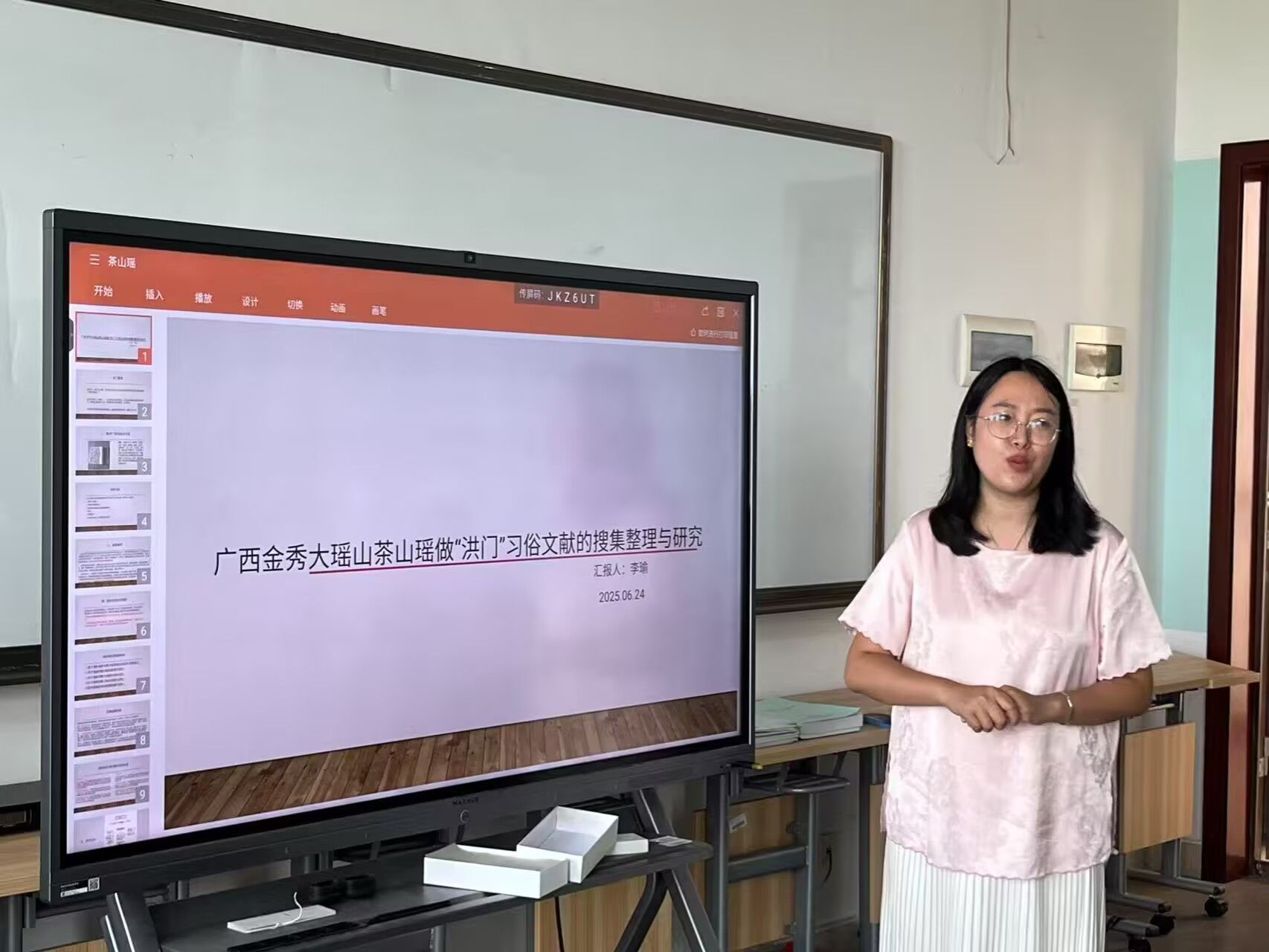 李瑜老师带来了题为《广西金秀大瑶山茶山瑶做“洪门”习俗的文献搜集整理与研究》的分享。李老师详细介绍了在广西金秀大瑶山开展茶山瑶“洪门”习俗文献搜集整理工作的过程,她提出“洪门”习俗作为茶山瑶文化的重要组成部分,蕴含着丰富的民族智慧和文化内涵,对其进行深入研究,不仅有助于保护和传承民族文化,筑牢中华民族共同体,还能为社会工作在民族地区的开展提供有益借鉴。