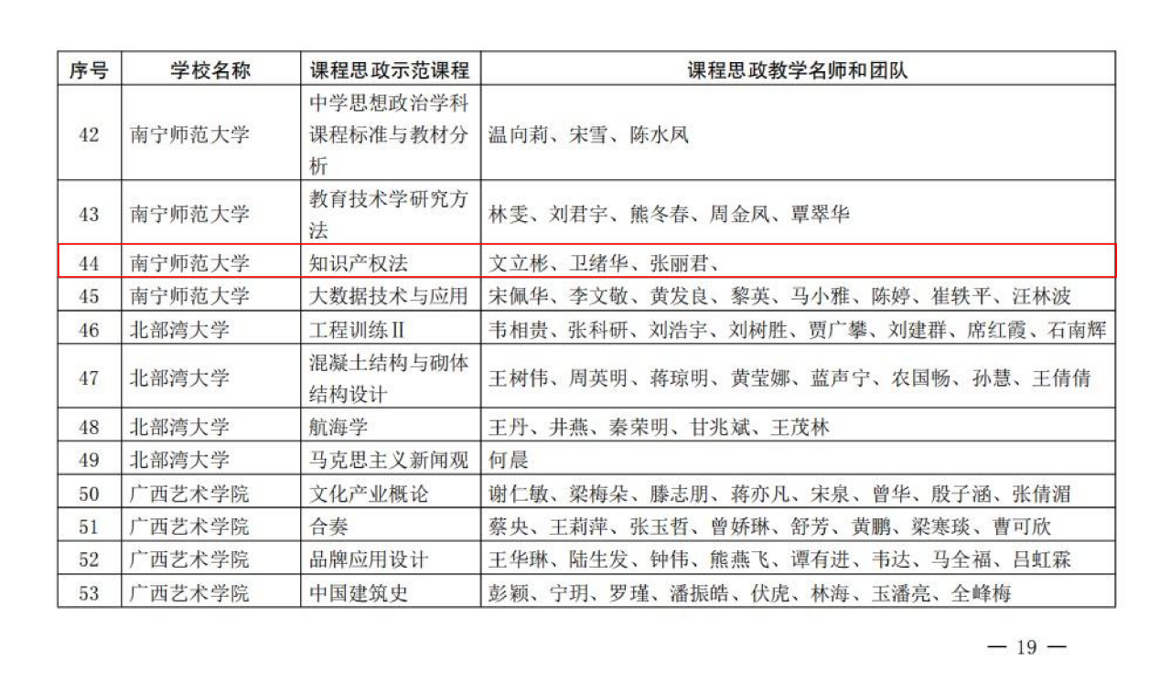 近日,广西壮族自治区教育厅公布了《自治区教育厅关于公布2023年全区高校课程思政示范课程和课程思政示范基层教学组织名单的通知》,公司法律系文立彬老师主持的《知识产权法》荣获自治区级课程思政示范课程(本科)。文立彬老师被广西教育厅认定为自治区级课程思政教学名师,知识产权法教学团队被认定为自治区级课程思政教学团队。公司知识产权法课程思政教学团队由法律系文立彬副教授、卫绪华副教授和张丽君博士组成,知识结构完善、教学能力突出、课程特色明显、专业素质过硬。