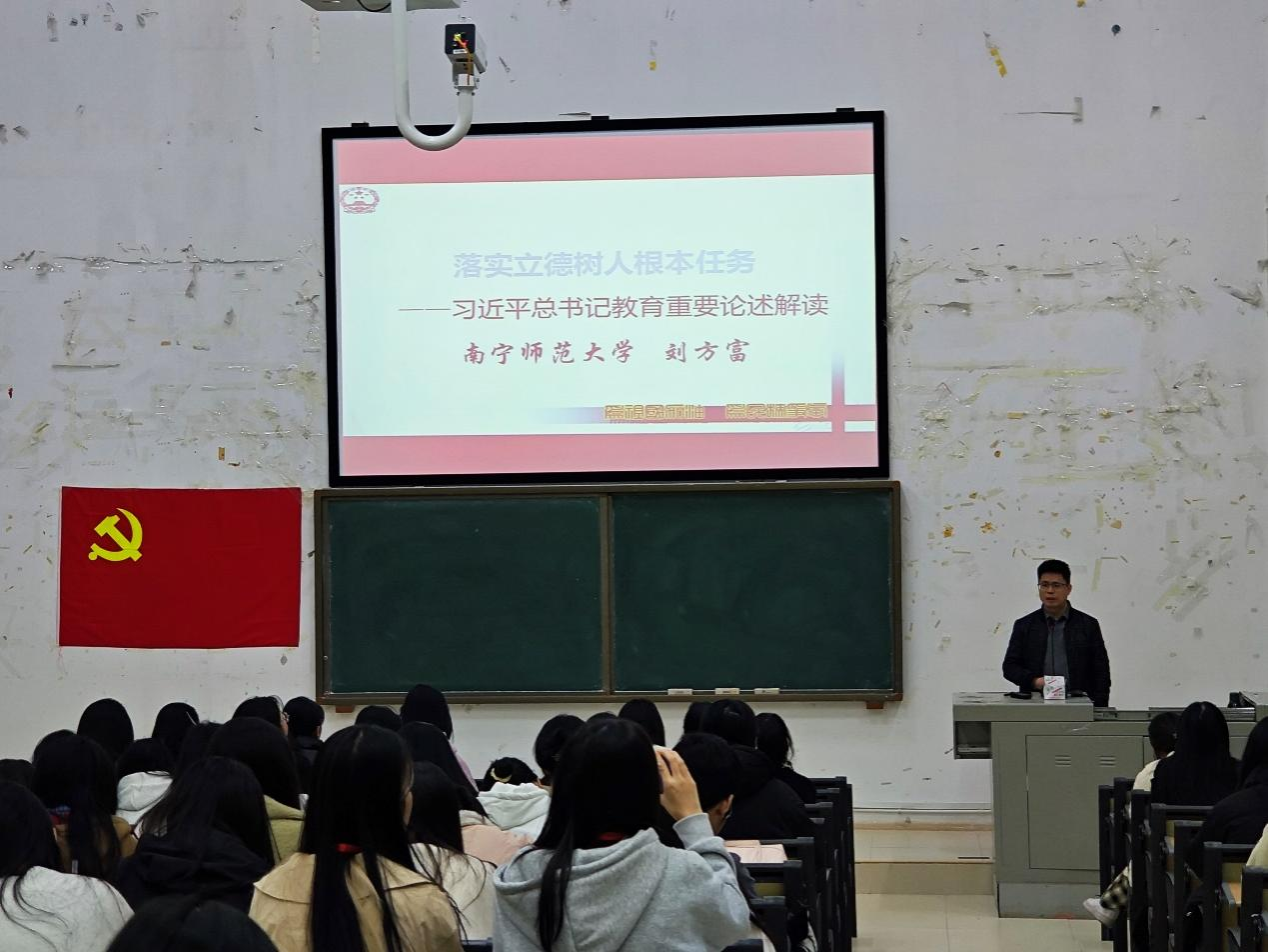 在第二讲课中,刘方富教授以落实立德树人根本任务为主题-习近平总书记教育重要论述解读,围绕什么是素养、培养什么人、立什么德及如何立德树人等方面进行论述。他指出教育改革要从问题出发,要树立多样化的人才管理体系,更要致力于德智体美劳全面发展。刘教授将习近平总书记教育重要论述归纳为四个方面:一个核心、两翼驱动、三个抓手、四个保障,启示我们应树立正确的价值观,做“四有”好老师。