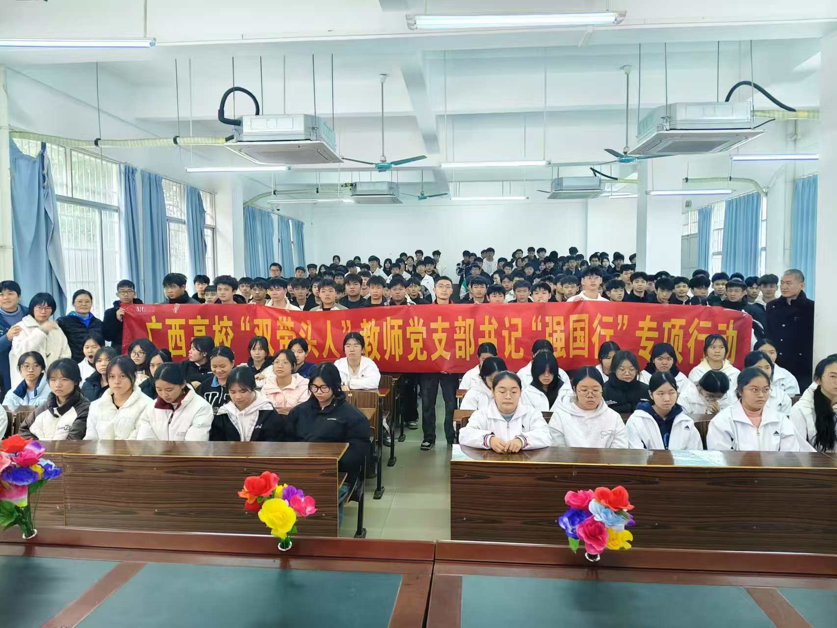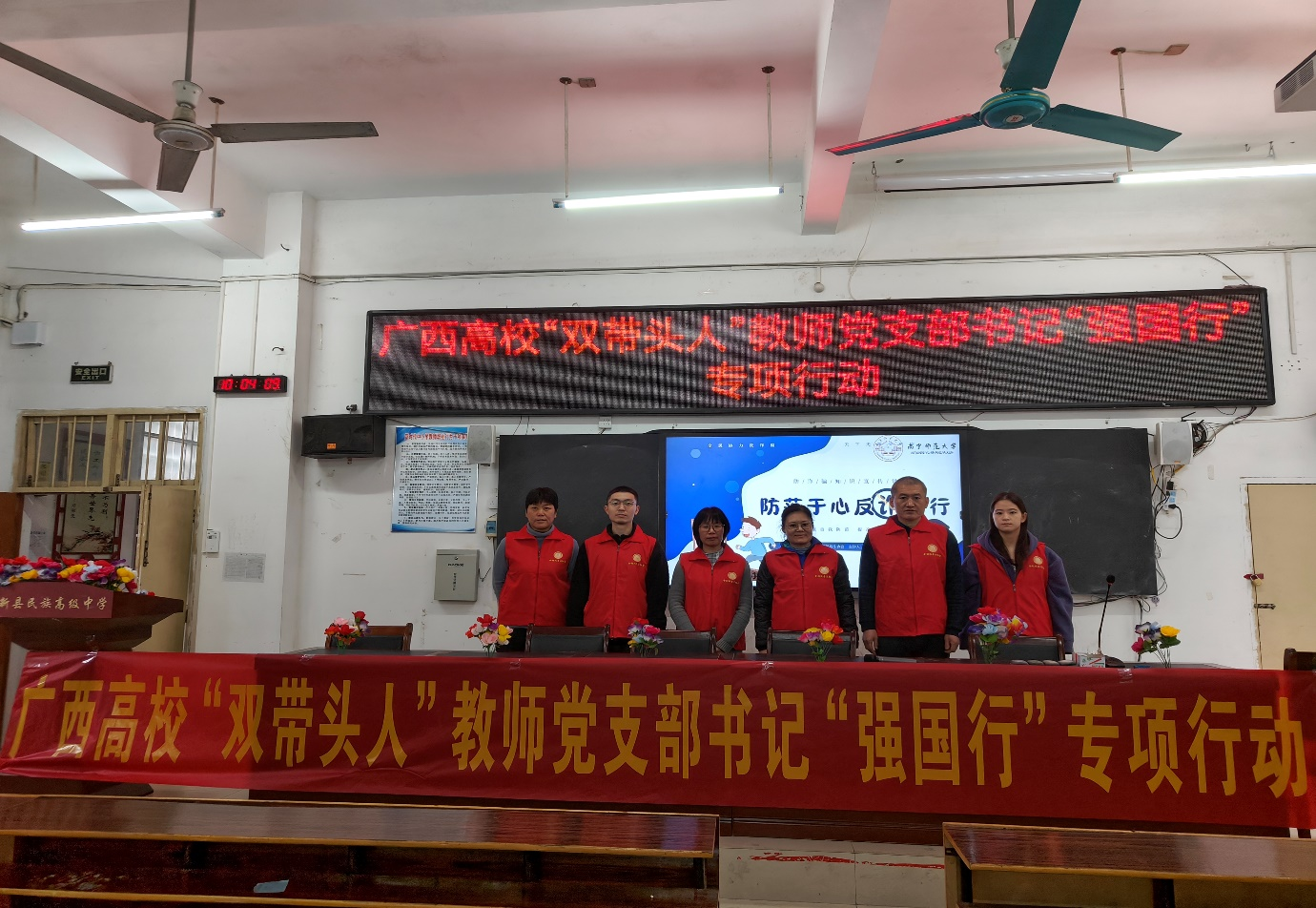 2024 年 12 月 26日,法律系教工党支部书记陈文琼带队赴大新县开展广西高校“双带头人”教师党支部书记“强国行”专项行动,以现场指导普法讲师团讲授普法公益课程的方式,突出师生共育、教学相长,引导师生服务支持地方法治教育事业发展,大力塑造“党建+法治教育”的特色品牌,推进党建育人成效,以“送法进校园”专项行动展现新作为。